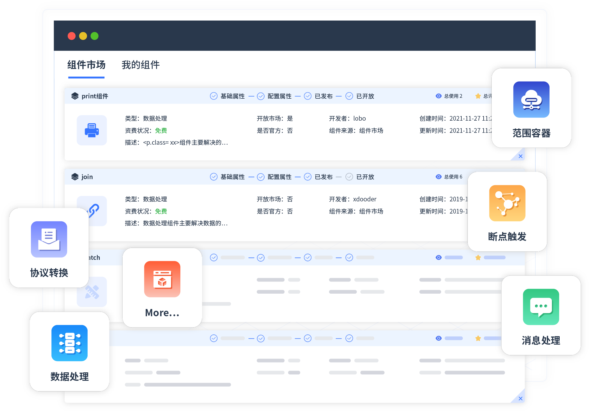 针对集成场景,凯发天生一触即发提供组件市场,例如协议转换、消息处理、文件操作等。除平台提供的组件外,客户可以自定义所需组件。