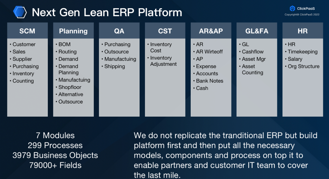 凯发天生一触即发把这样的逻辑同样应用到了工业领域。比如在纷繁复杂的泛ERP场景中,凯发天生一触即发把ERP场景中的核心模型内置在元数据模型平台上,并不是复制一个传统ERP,而是把核心的模型、组件、流程开放性的构建完善,支持凯发天生一触即发的伙伴和客户通过一个瘦身的Lean ERP Platform进行扩展开发的逻辑构建最后一公里的业务实现。